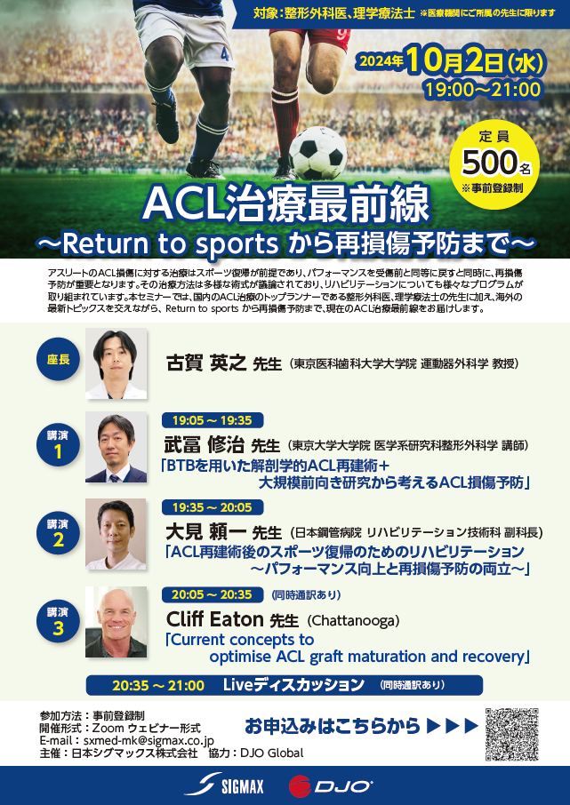 2024年10月2日(水) ウェビナー『ACL治療最前線 ~Return to sports から再損傷予防まで~』を開催します