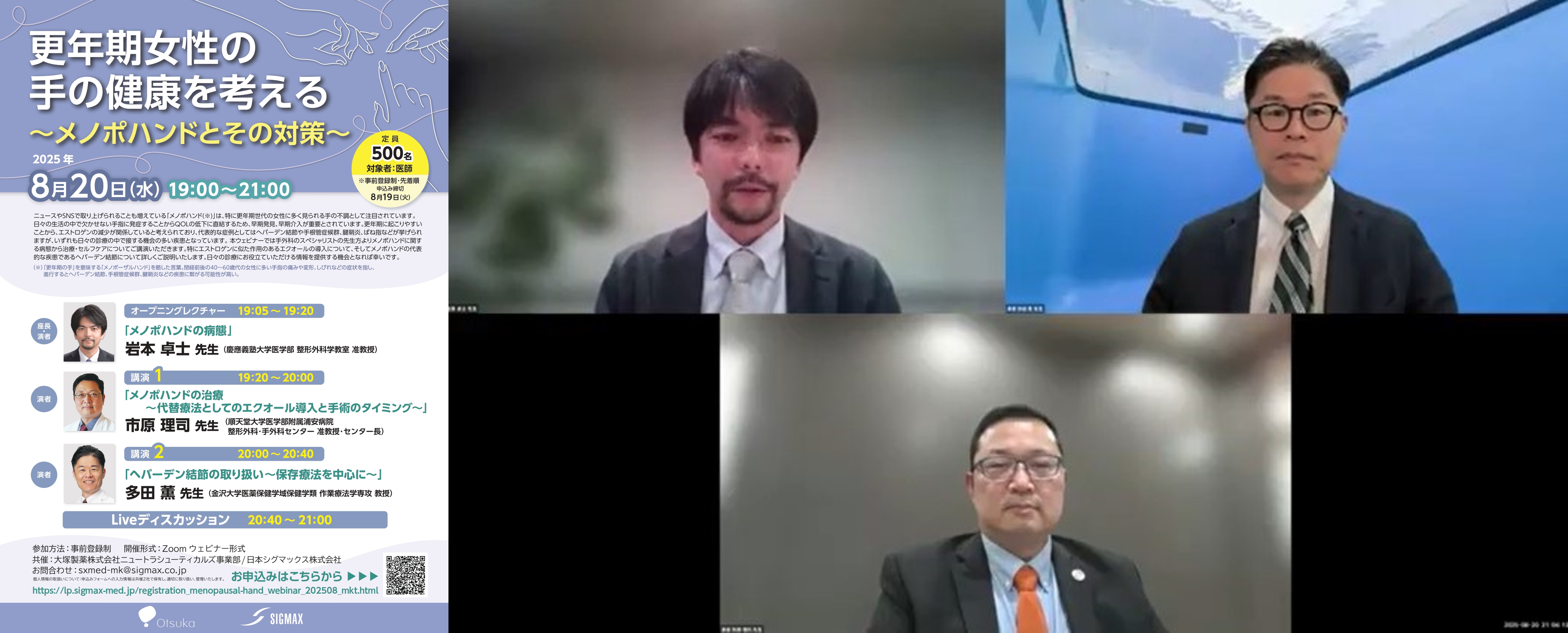 本動画では、手外科のスペシャリストの先生方より、更年期世代の女性に多く見られる手の不調として注目されている「メノポハンド(※)」に関する病態から治療・セルフケアについてご講演いただきました。