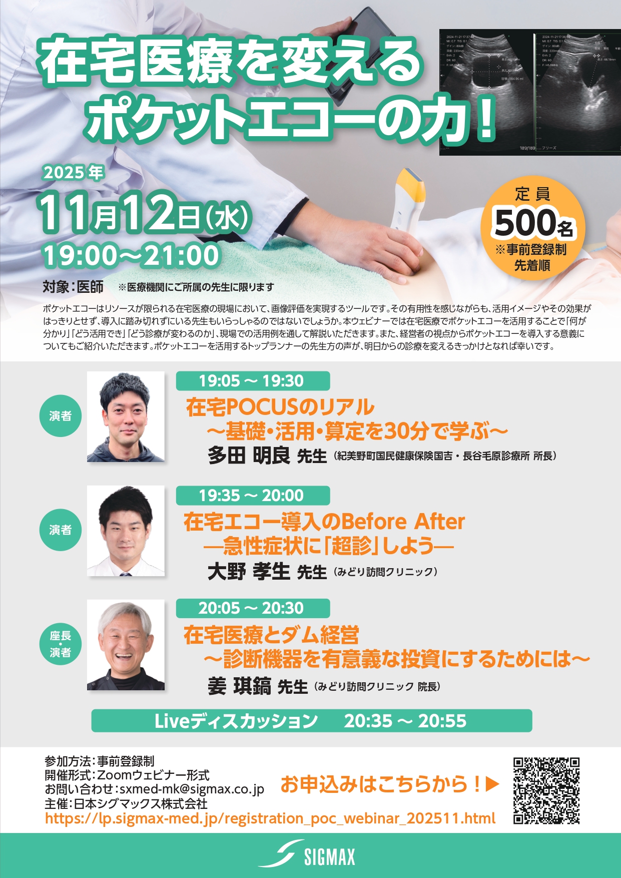 弊社は2025年11月12日(水)に、ウェビナー『在宅医療を変えるポケットエコーの力!』を開催いたします。