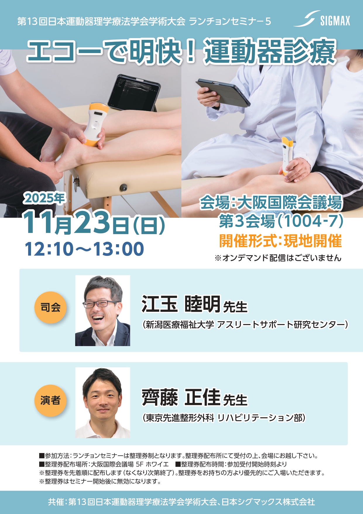 司会に江玉 睦明 先生(新潟医療福祉大学)をお招きし、演者の齊藤 正佳 先生(東京先進整形外科)から「エコーで明快!運動器診療」を、テーマにご講演いただきます。